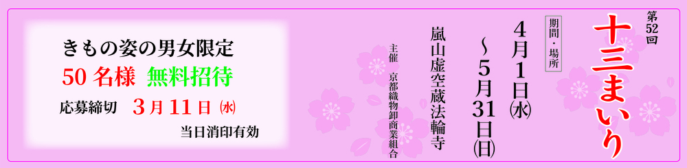 --------- 数え年十三歳を迎える子どもたちの健やかな成長を願う京の伝統行事「十三まいり」をきもの姿の方を対象にご招待いたします。申込期間は2月1日(日)~3月11日(水)まで。