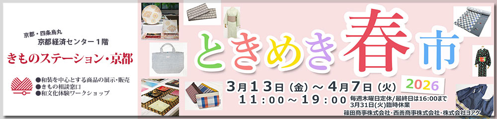 --------- 3月13日(金)~4月7日(火)は、篠田商事株式会社・西善商事株式会社・株式会社ヨアケによる『ときめき春市2026』。襦袢・小紋等反物、お皿、伊勢木綿反物・小物など。