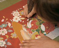 図案から下絵、挿し友禅など、丁寧な手仕事は、それぞれに専門の業者・職人を配す完全分業制をとり、いずれの職人にも高い技術が求められます。