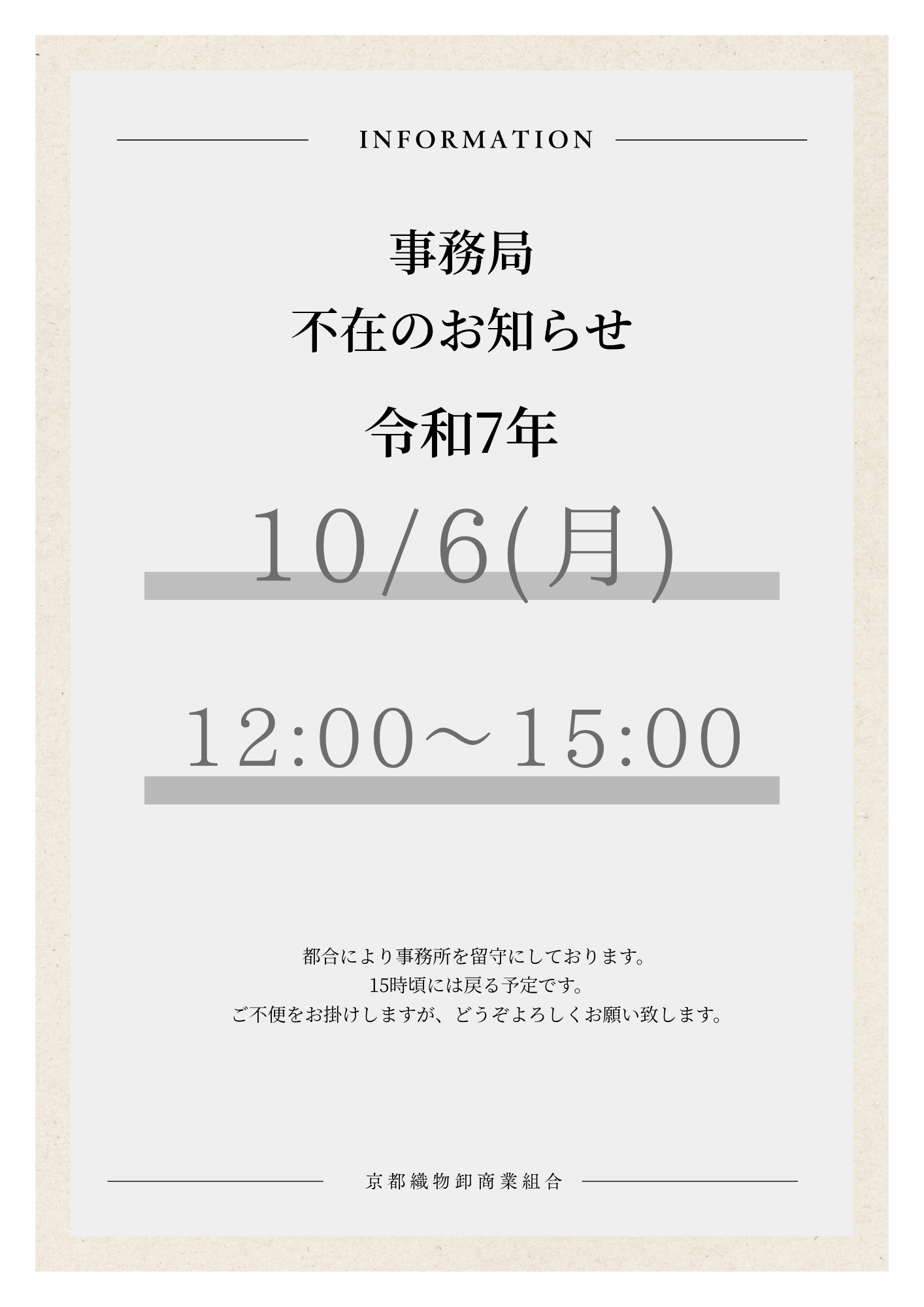 事務局不在のお知らせ(R7.10.6 12:00~15:00)